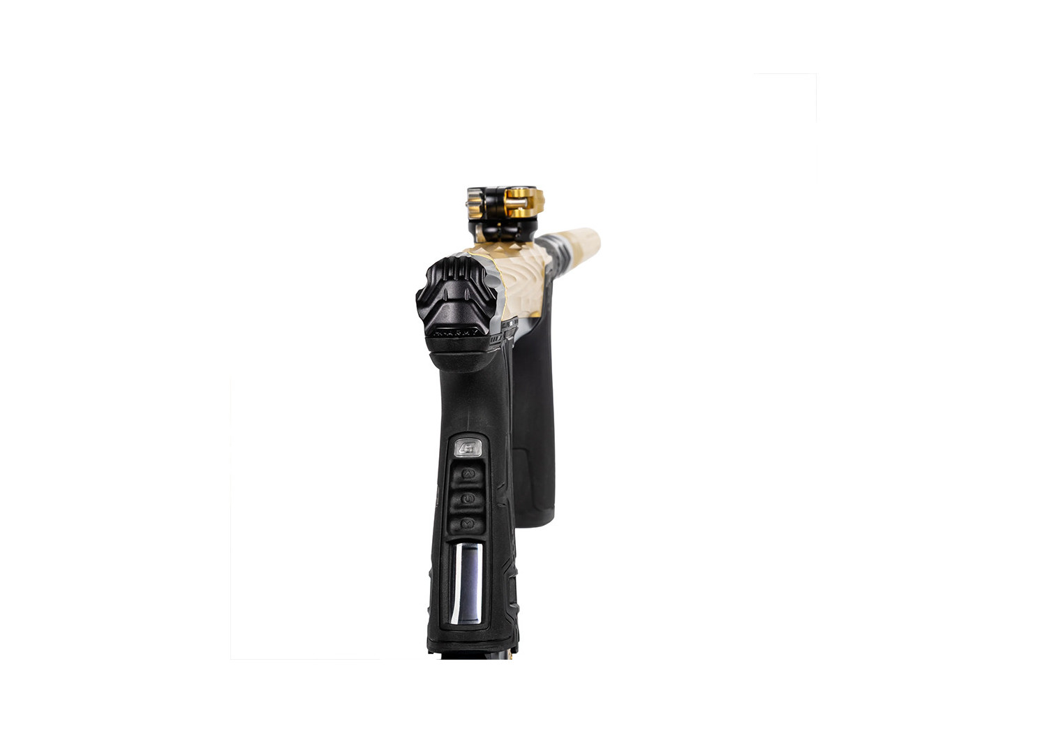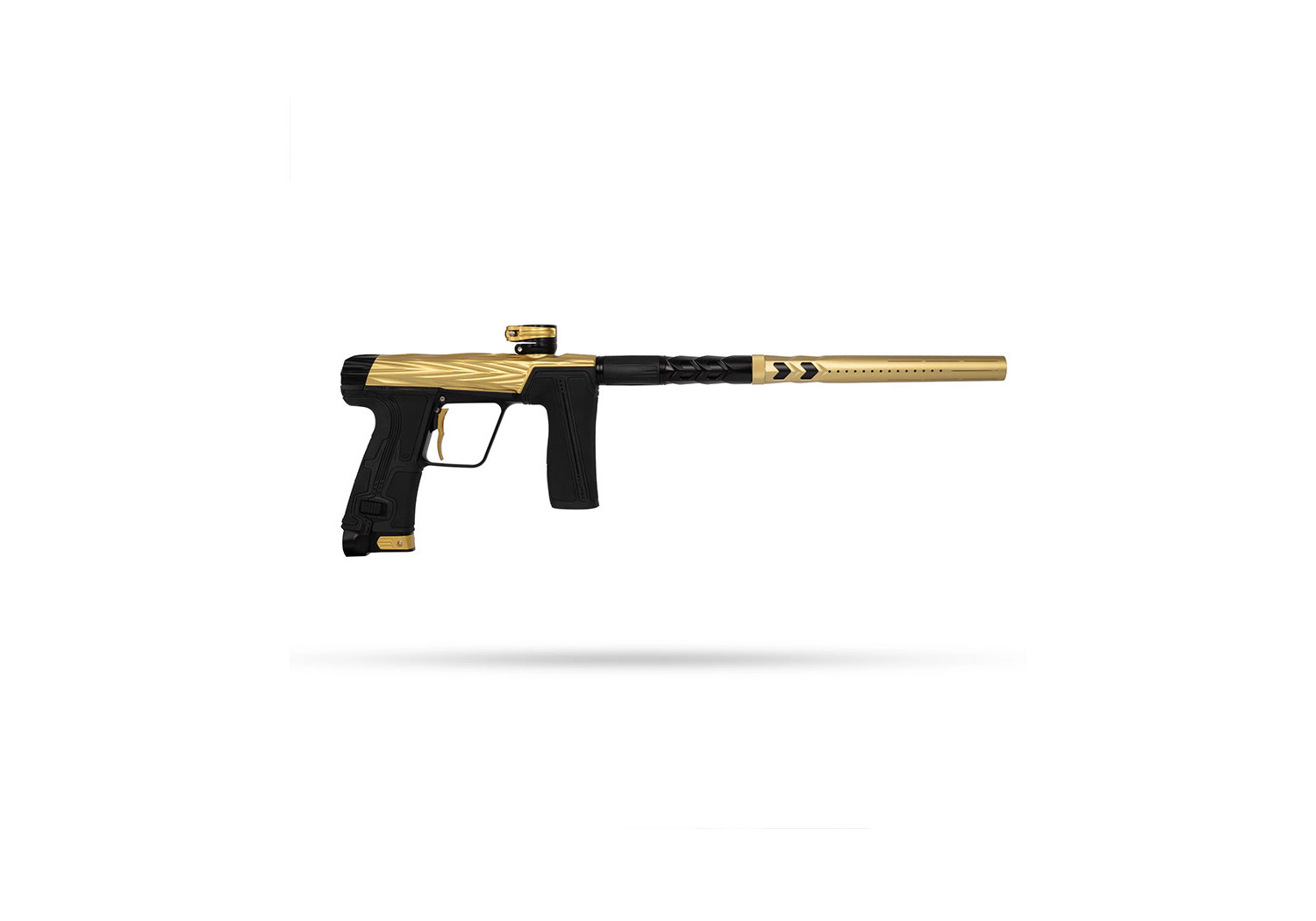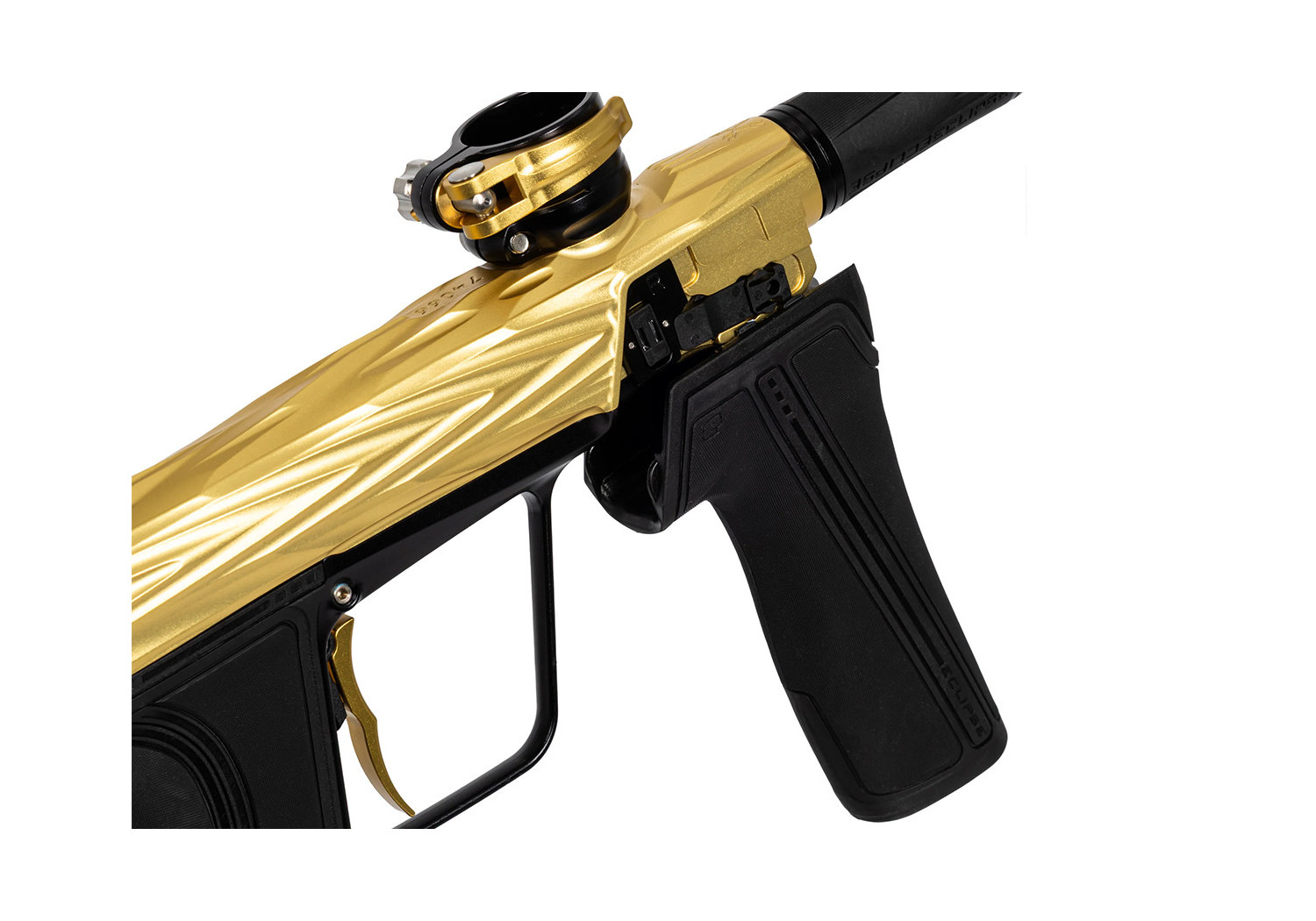 The milled aluminum body feels robust and refined, and the streamlined foregrip / frame interface makes the marker comfortable to handle — plus, the gold-Midas finish gives it a classy, premium look.