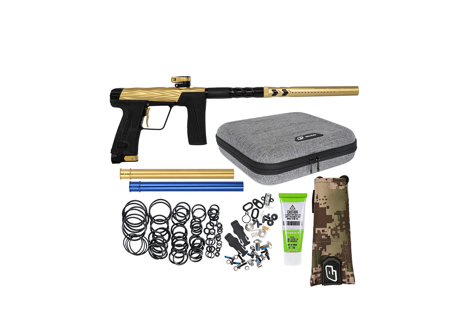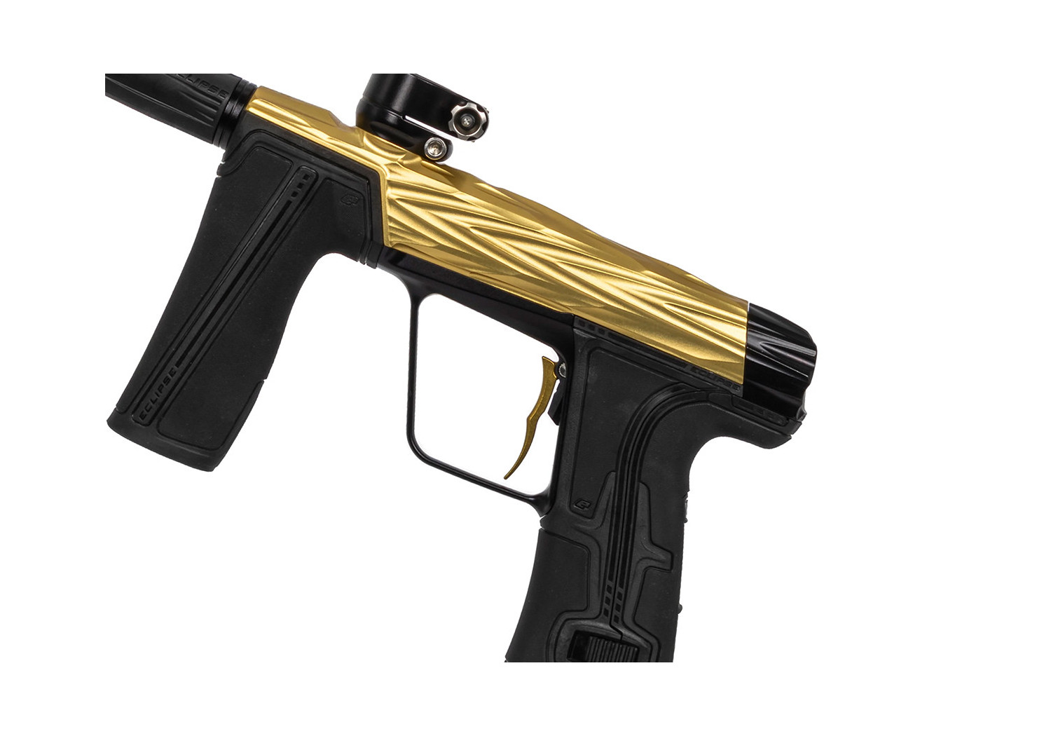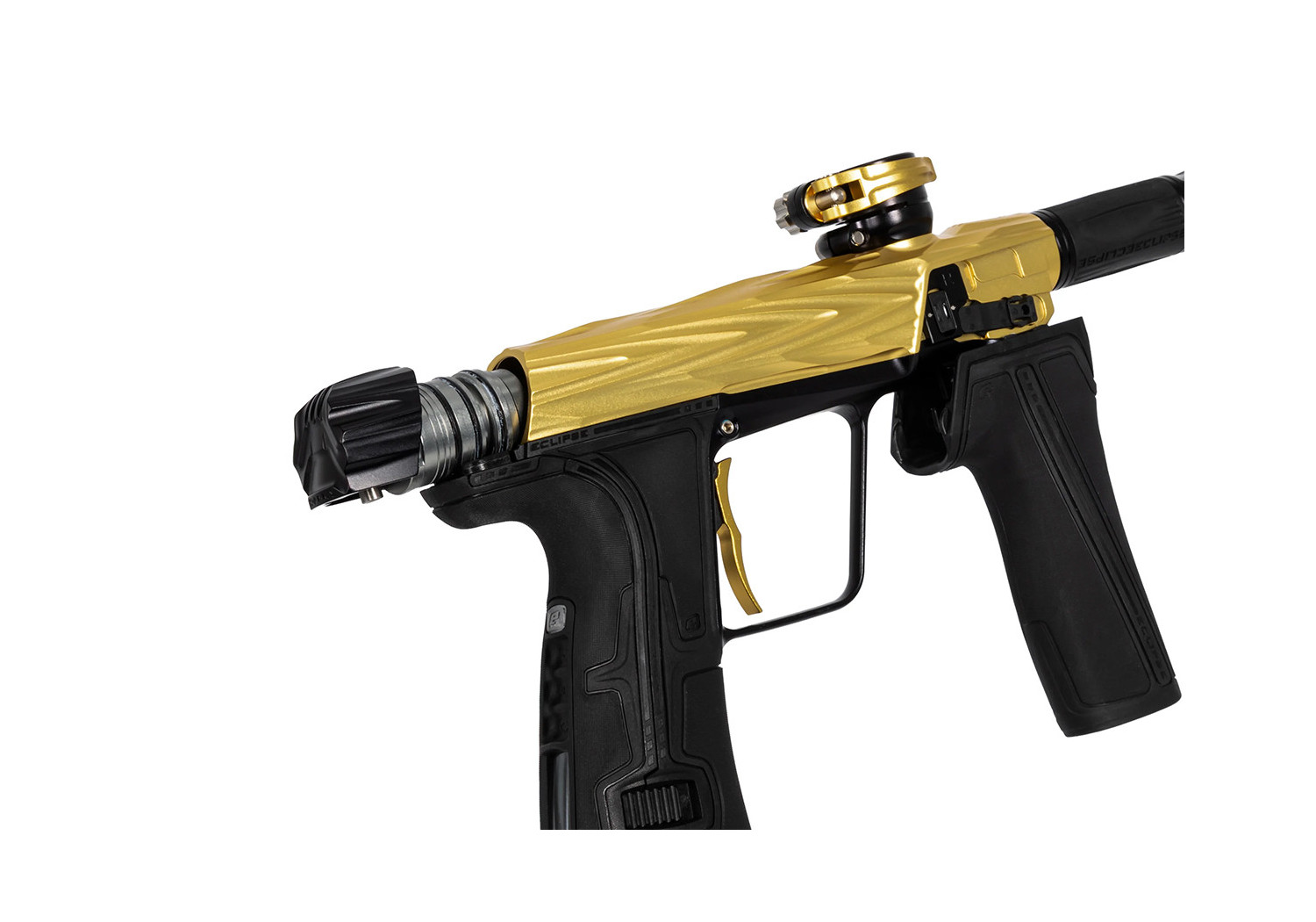 The milled aluminum body feels robust and refined, and the streamlined foregrip / frame interface makes the marker comfortable to handle — plus, the gold-Midas finish gives it a classy, premium look.